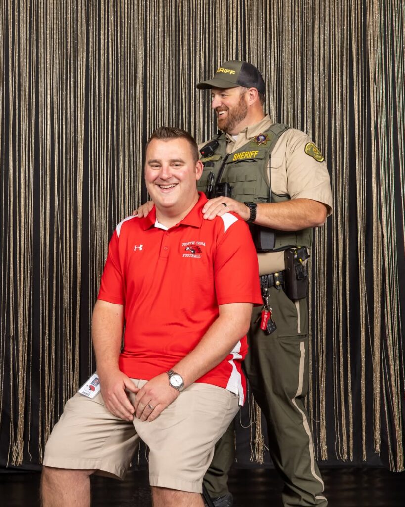 - Tama County Sheriff Casey Schmidt, standing, comically poses for a Homecoming photo alongside North Tama Principal Taylor Howard on Friday, Oct. 3, at the high school in Traer. The two were participating in the “awkward photo trend” inspired by the 2008 film “Step Brothers” starring Will Ferrell and John C. Reilly. Sheriff Schmidt and Principal Howard both worked as chaperones for the Friday evening dance. “I am sure those photos will be on display for a long time to come,” Sheriff Schmidt explained of the destined-to-be-classic snaps. “It was all in good fun and a good reminder of how lucky we are to live and serve in a place like Tama County.” PHOTO BY AMY LIDGETT OF AMY’S IMAGES