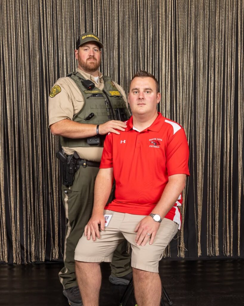 Tama County Sheriff Casey Schmidt, standing, comically poses for a Homecoming photo alongside North Tama Principal Taylor Howard on Friday, Oct. 3, at the high school in Traer. The two were participating in the “awkward photo trend” inspired by the 2008 film “Step Brothers” starring Will Ferrell and John C. Reilly. Sheriff Schmidt and Principal Howard both worked as chaperones for the Friday evening dance. “I am sure those photos will be on display for a long time to come,” Sheriff Schmidt explained of the destined-to-be-classic snaps. “It was all in good fun and a good reminder of how lucky we are to live and serve in a place like Tama County.” PHOTO BY AMY LIDGETT OF AMY’S IMAGES