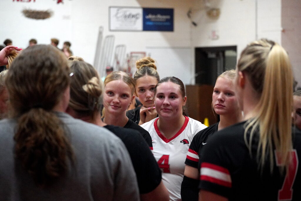 North Tama volleyball head coach Channing Halstead (second from left), flanked by assistant coach Karisa Kladivo (left), speaks to her players following their first set victory over BGM on Wednesday night in Traer. PHOTO BY RUBY F. MCALLISTER