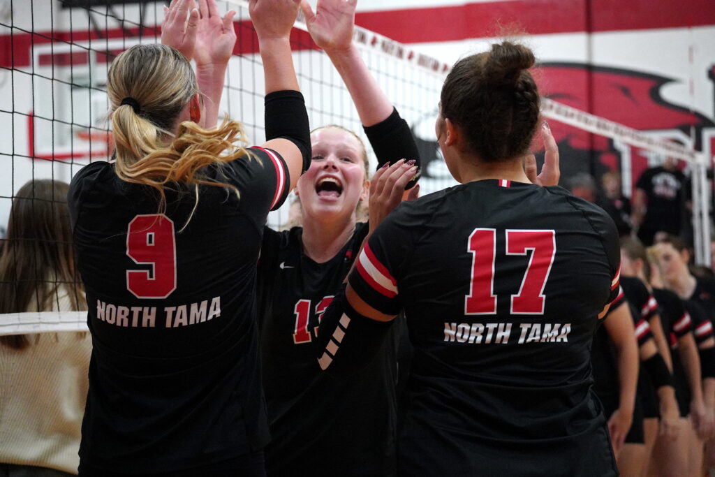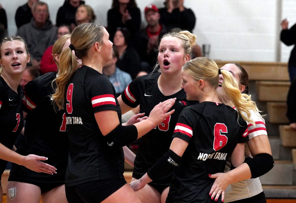 - The North Tama Redhawks celebrate a point during Wednesday’s Class 1A Region 3 quarterfinal match against BGM in the Redawks Nest in Traer. PHOTO BY RUBY F. MCALLISTER