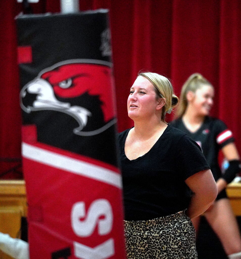 - Redhawk head coach Channing Halstead speaks to her team from the sidelines halfway through North Tama’s 25-7 first set routing of the BGM Bears Wednesday evening in Traer. PHOTO BY RUBY F. MCALLISTER