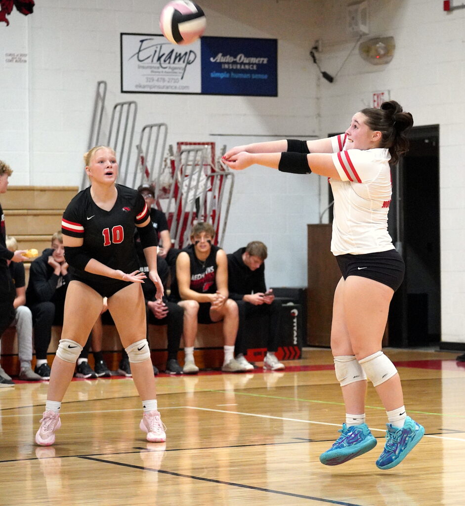 - Redhawk junior defensive specialist Grace Dvorak, left, and freshman outside hitter Alaney Sienknecht, right, await BGM’s service Wednesday evening. PHOTO BY RUBY F. MCALLISTER
