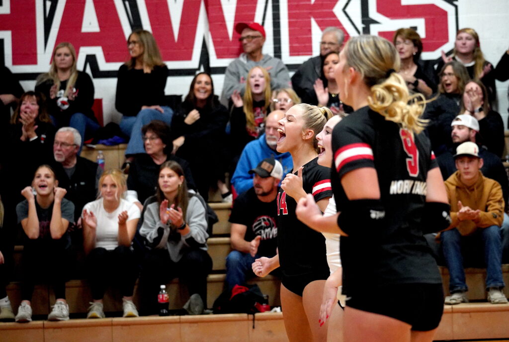 The North Tama Redhawks celebrate a point during Wednesday's Class 1A Region 3 quarterfinal match against BGM in the Redawks Nest in Traer. PHOTO BY RUBY F. MCALLISTER