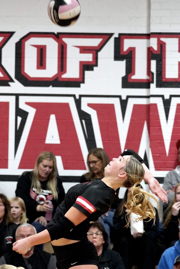 - Redhawk senior Cayleigh Heller sets up the ball perfectly Wednesday evening in Traer. PHOTO BY RUBY F. MCALLISTER