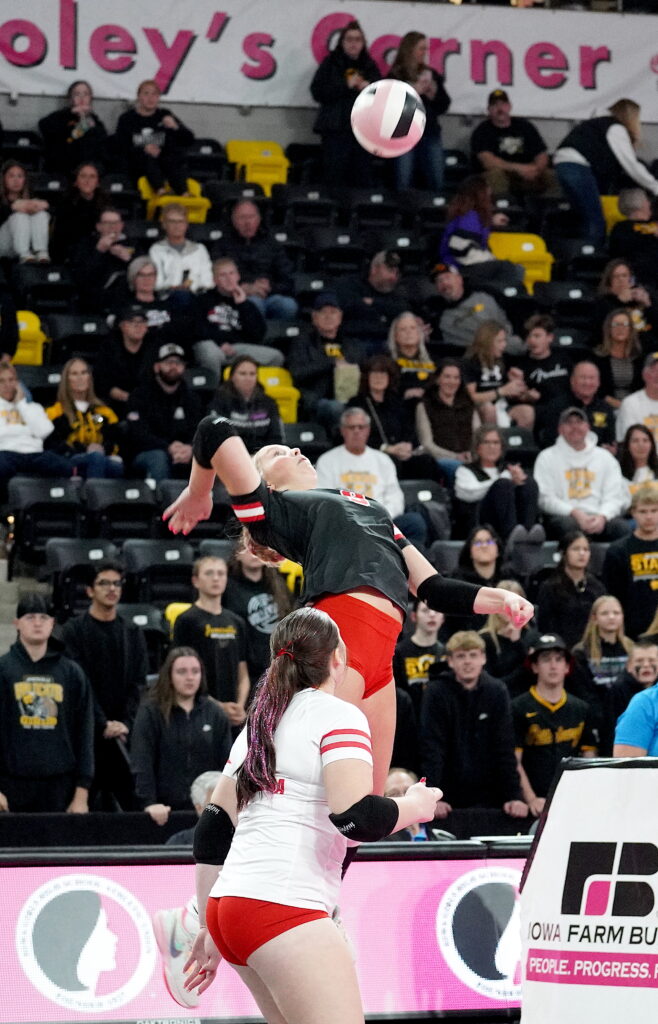 North Tama sophomore outside hitter Lily Sell lands a kill against the Janesville Wildcats during the Class 1A state semifinal match on Wednesday, Nov. 5, in Coralville. PHOTO BY RUBY F. MCALLISTER