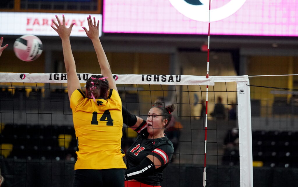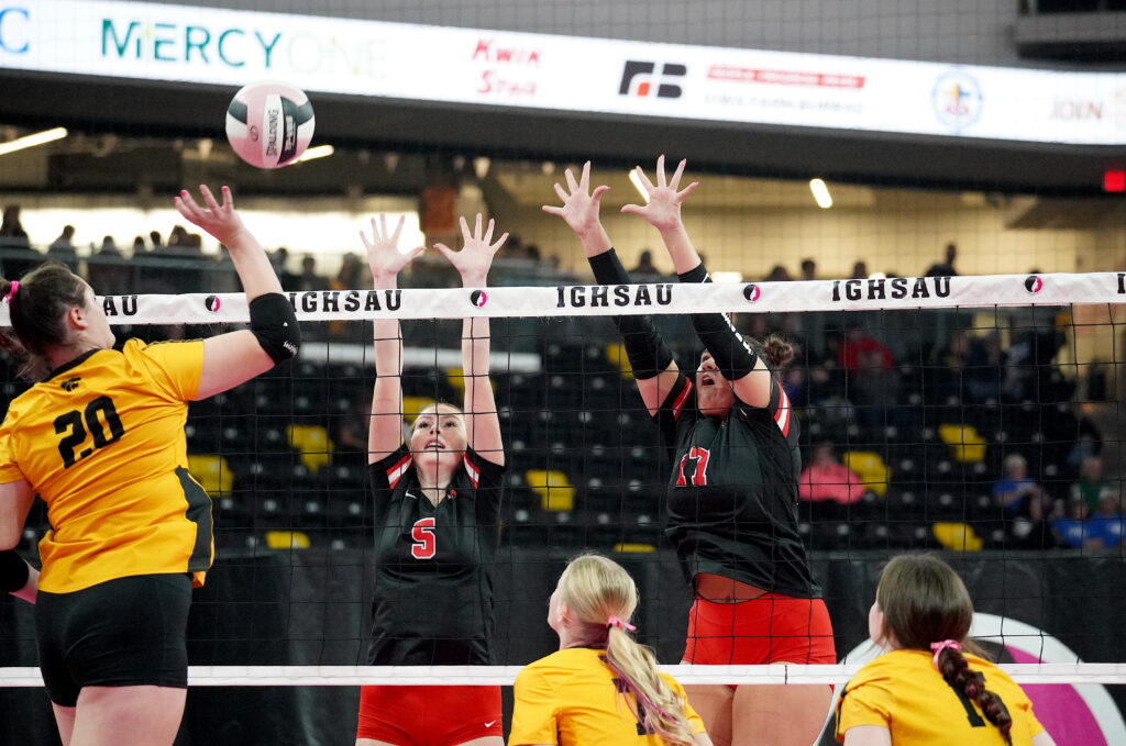 Redhawk sophomore outside hitter Lily Sell (17) successfully earns the point against the Janesville Wildcats’ 6-foot-4 freshman middle hitter Quinn Sweeney (20) following an offensive scramble during the third set of the Class 1A state semifinal match played in Coralville on Nov. 5. PHOTO BY RUBY F. MCALLISTER