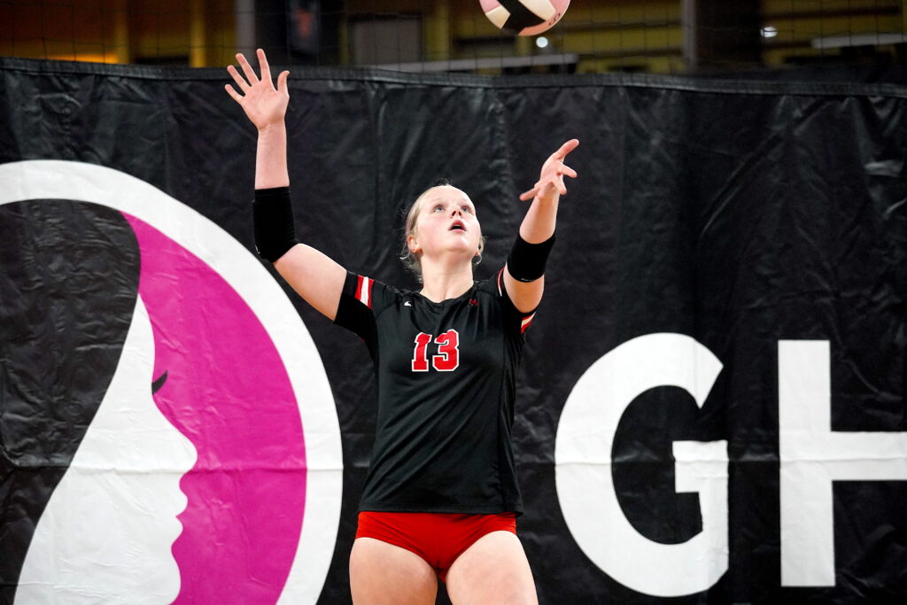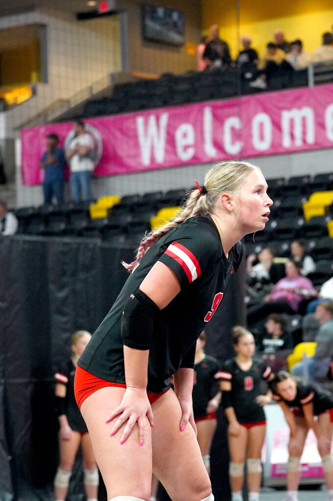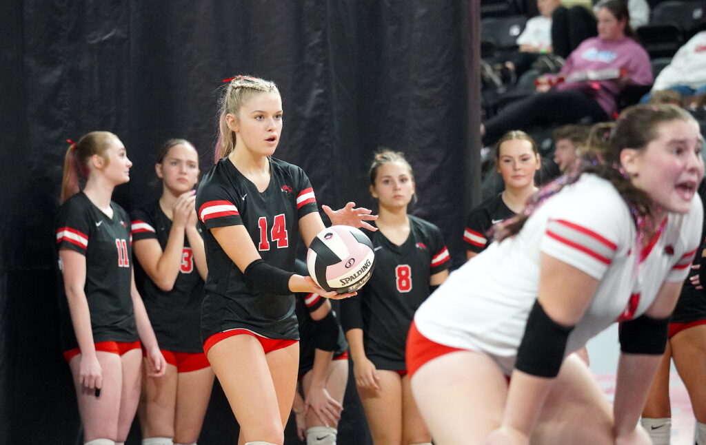 North Tama sophomore Isabelle Gropper (14) sets up her serve against the Janesville Wildcats during the Class 1A state semifinal match on Wednesday, Nov. 5, in Coralville. In total, the Redhawks served up four aces against Janesville, including two in a row from Gropper in the second set. PHOTO BY RUBY F. MCALLISTER