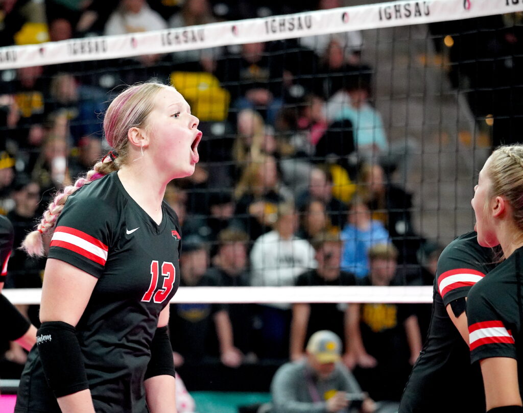 North Tama freshman Alaney Sienknecht (13) enthusiastically celebrates a point earned during the Redhawks’ semifinal match with Janesville on Nov. 5 during the state volleyball tournament in Coralville. PHOTO BY RUBY F. MCALLISTER