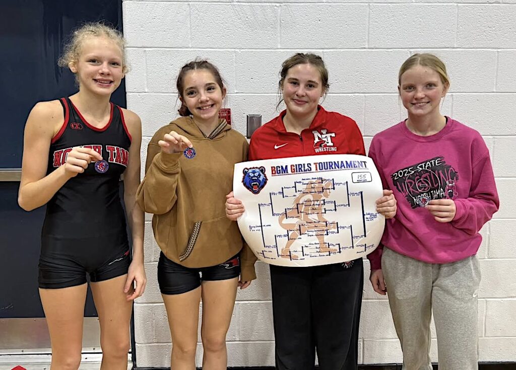 - The North Tama girls wrestling squad brought home a fifth-place finish, including four medals at last Saturday’s season-opening BGM Girls Tournament in Brooklyn. From left, medalists Arabelle Zook (bronze), Nylah Spinks (silver), Addy Hochstetler (gold), and Grace Dvorak (silver). PHOTO COURTESY ANDREW KNAACK