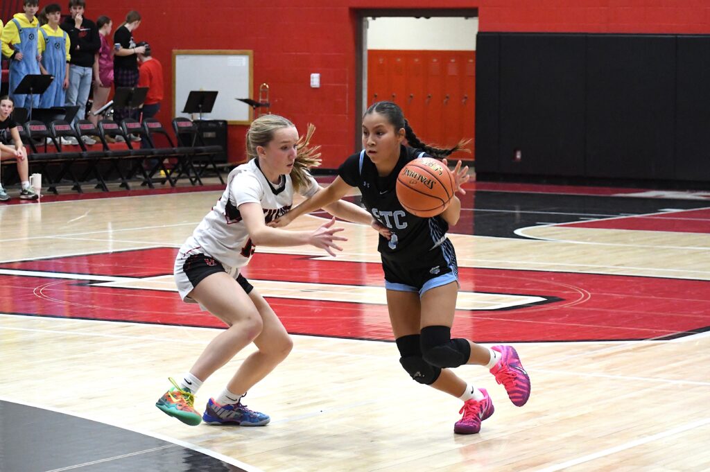 Union freshman Paige Pipho (left) works to stop South Tama County’s Cahysia Kapayou as she drives to the basket on Monday, Dec. 8, in La Porte City. PHOTO BY STEVE BRANDT/TAMA-TOLEDO NEWS CHRONICLE