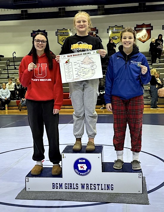 - Union/G-R wrestler Ella Wagner, left, pictured with her third-place medal on the 155-pound podium during the BGM Holiday Brawl in Brooklyn on Saturday, Jan. 3, 2026. Also pictured, bracket champion Kiersyn Duncombe of Louisa-Muscatine (center) and runner-up Breegan Ellison of Moravia (right). PHOTO COURTESY OF GLADBROOK-REINBECK SCHOOLS/FACEBOOK
