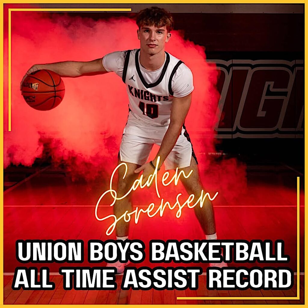 Ten Union players scored that evening, including senior Caden Sorensen who led with 18 points (four 3-pointers). He also had five assists and two of the Knights’ five steals.