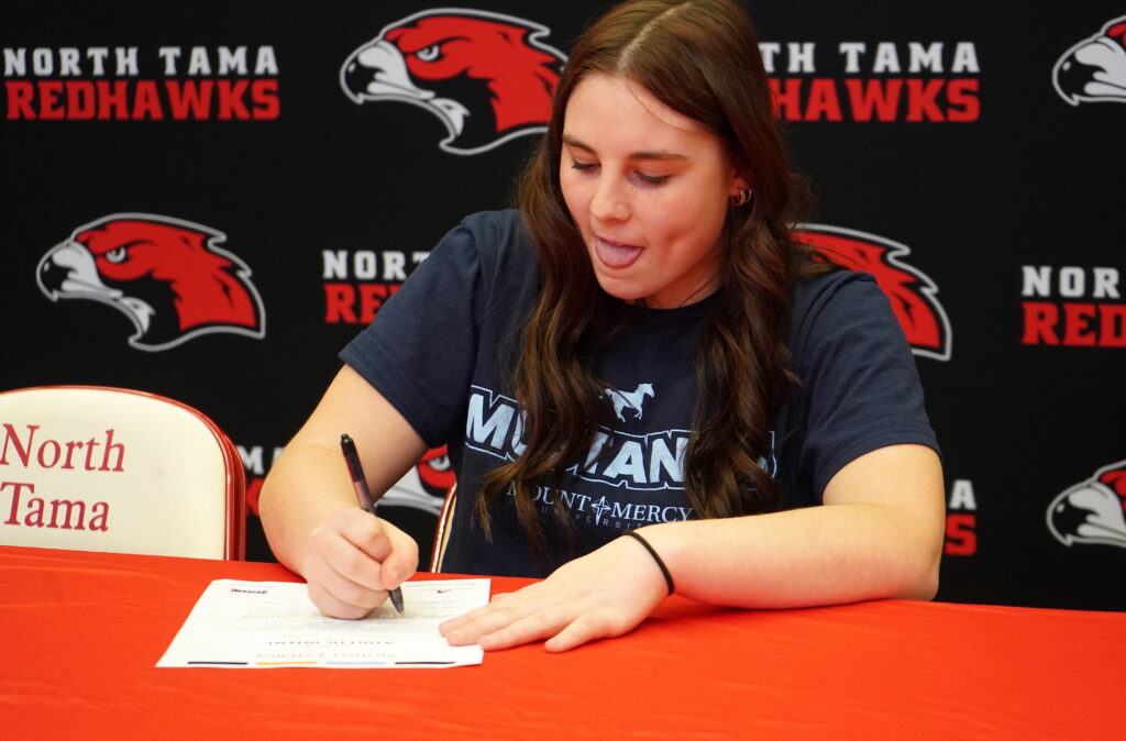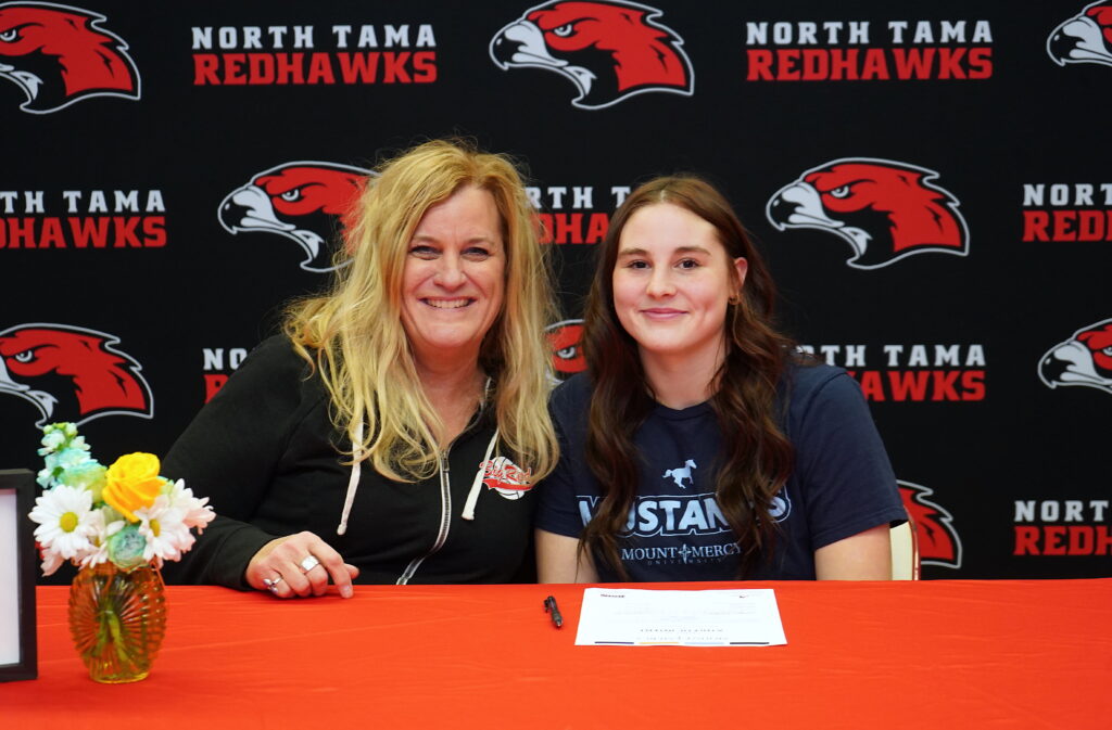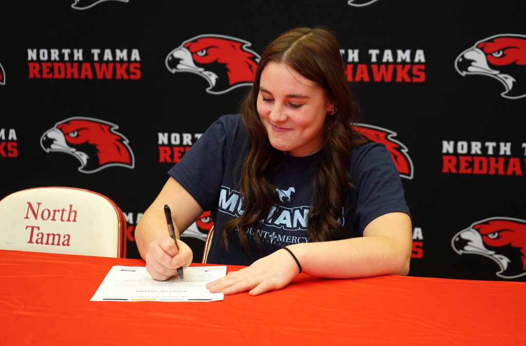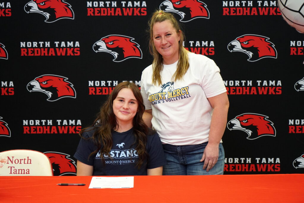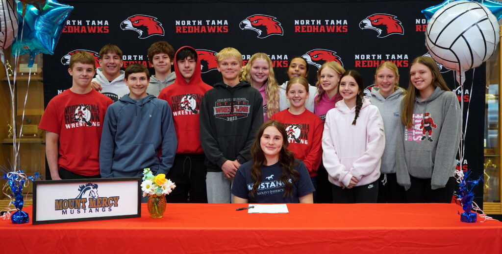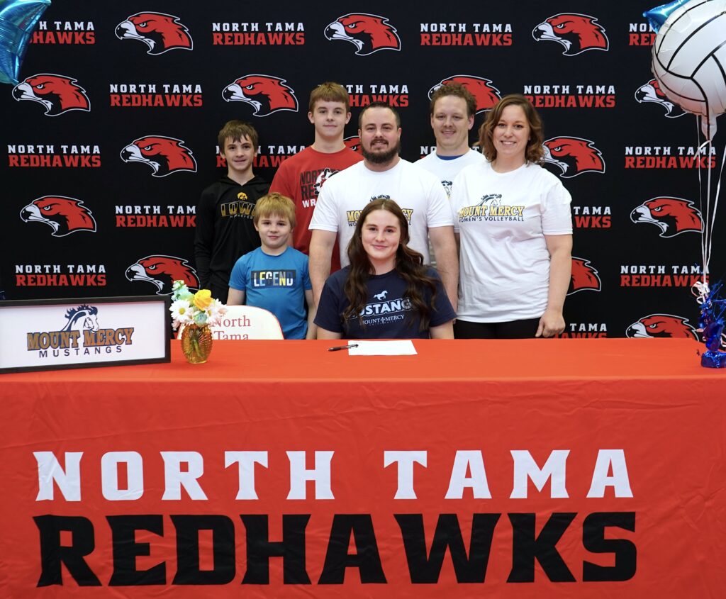 Between a brief lull in winter weather events on the afternoon of Thursday, Jan. 22, North Tama’s Addison “Addy” Hochstetler gathered with her family, coaches, and fellow Redhawk student-athletes in the high school gym commons to sign her letter of intent to play volleyball next school year with the Mount Mercy University Mustangs in Cedar Rapids.