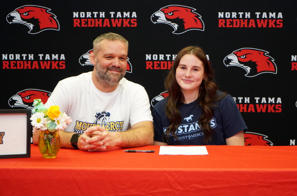 - North Tama senior Addy Hochstetler smiles after signing her Letter of Athletic Intent for Women’s Volleyball at Mount Mercy University on Thursday, Jan. 22, 2026, in Traer. Hochstetler, a four-time all-conference first team libero pick, will receive $25,000 annually in total institutional academic and athletic aid as part of her signing. PHOTO BY RUBY F. MCALLISTER