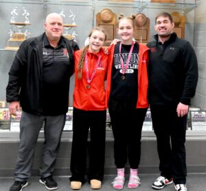 VINTON – North Tama senior wrestler Drayke Dvorak became the third Redhawk wrestler this season to reach the coveted 100 career wins milestone after competing on Thursday, Jan. 29, in a multi-team dual hosted by Vinton-Shellsburg that also included Grinnell, Iowa Valley, and Regina Catholic (Iowa City). Wrestling at 138 pounds, Dvorak (fourth from right) went 3-0 on the evening, notching pinfall wins over Grinnell’s Ayden Cameron in 1 minute, 18 seconds, and Regina’s AJ White in 3 minutes, 12 seconds. He also recorded a win by 16-1 technical fall over Iowa Valley’s Brycen Schwabe. Dvorak joins fellow Redhawk senior wrestlers Addy Hochstetler (second from right) and Max Monat (third from right) in reaching 100 career wins this season.