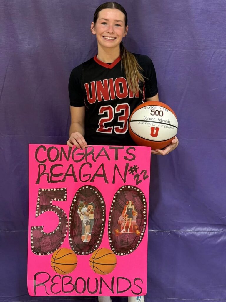 LE GRAND – Knights senior Reagan Glenn helped lead the Union girls basketball team to its fifth and final win of the 2025-26 season back on Tuesday, Jan. 27, by pulling down a team-high eight rebounds against the East Marshall Mustangs to reach the 500th rebound of her high school career. Union head coach Matt Craft posted to social media following the game: “This puts [Glenn] in the 99.9 percentile for high school players in the state and, by my math, one of only [eight] girls in Union history to do it and the first since Sam Phillips in 2013.” He added that at 5-foot-seven, Glenn is “probably one of the shortest players in the state to reach that milestone, but gets it done with quickness and a great ability to read where the ball is going.” Glenn also recorded three steals and a field goal during Union’s 47-26 conference win over East Marshall. She ended the 2025-26 season as the Knights’ top-rebounder with 76; No. 2 in points scored with 117; and No. 3 in steals with 35.