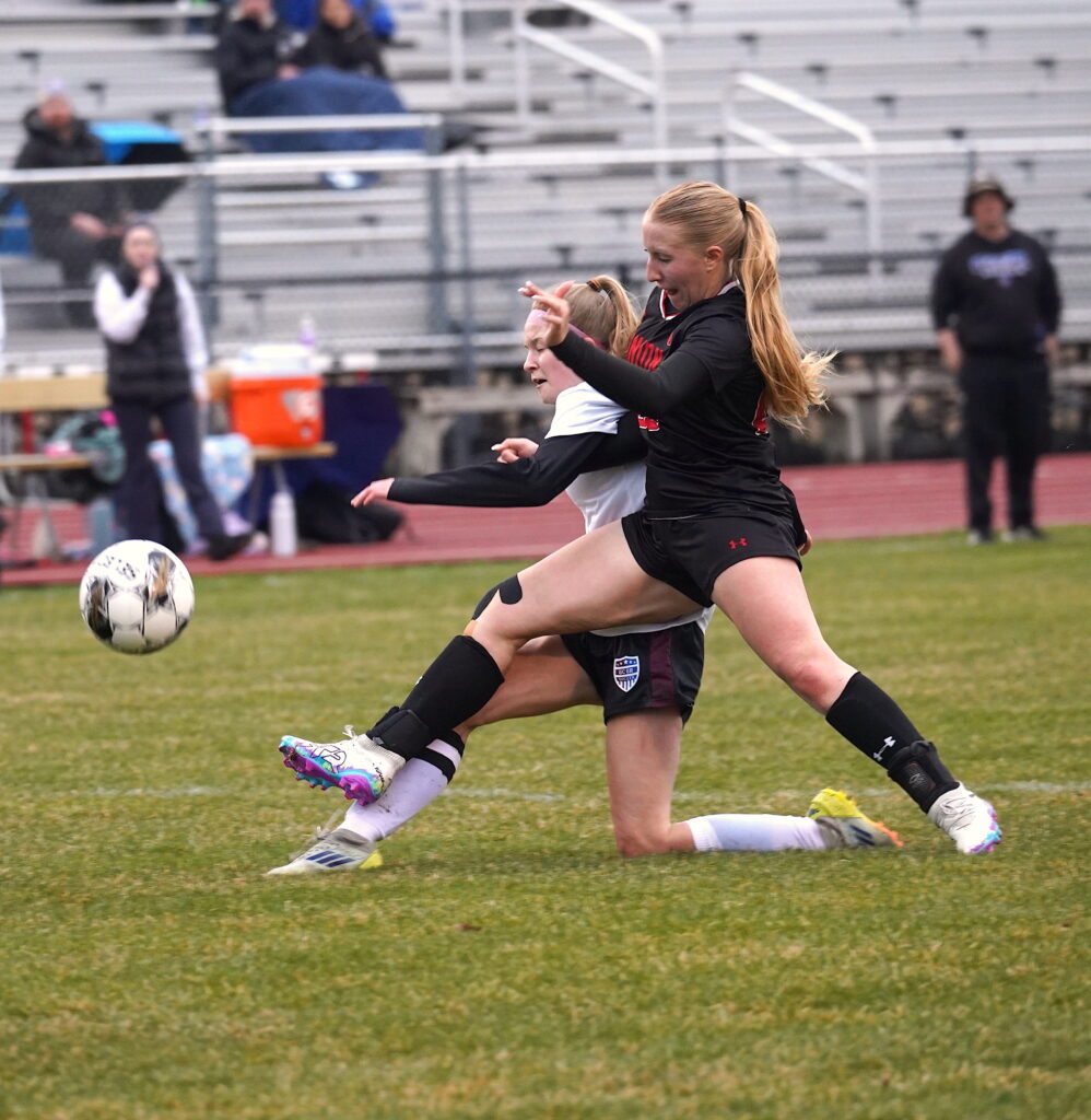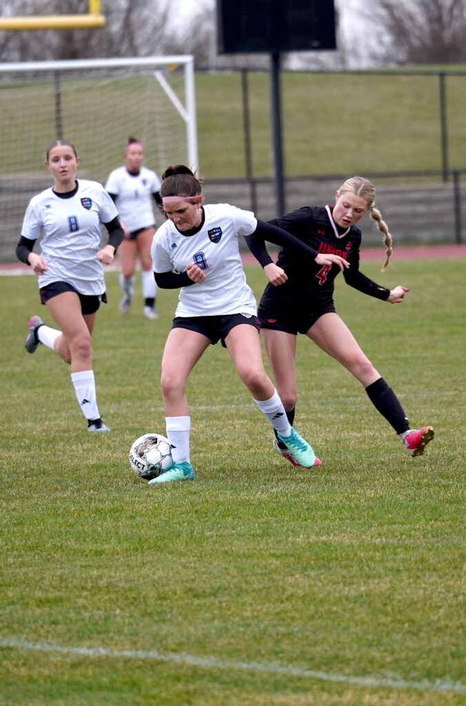 Union-North Tama sophomore Ellie Pospisil (4) fights to regain control of the ball from GCGR defender Ayla Baer on April 9 in La Porte City. PHOTO BY RUBY F. MCALLISTER