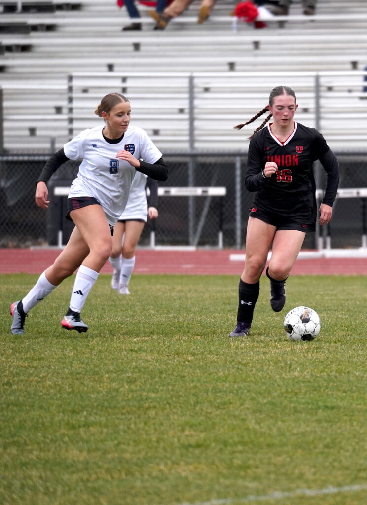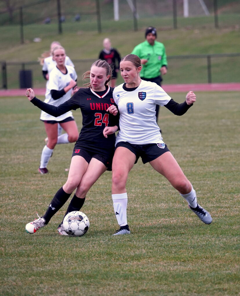 - Union-North Tama sophomore Ellie Pospisil (4) fights to regain control of the ball from GCGR defender Ayla Baer on April 9 in La Porte City. PHOTO BY RUBY F. MCALLISTER