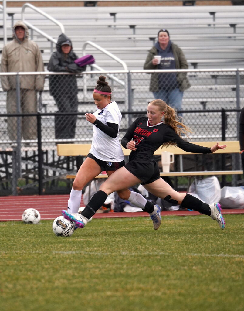 Union-North Tama junior defender Grace Ruzicka (25) works to stop Grundy Center/Gladbrook-Reinbeck junior Prycely Beard April 9 in La Porte City. The Knights’ defense spent much of the evening in constant motion against the Rebels’ ample firepower. PHOTO BY RUBY F. MCALLISTER