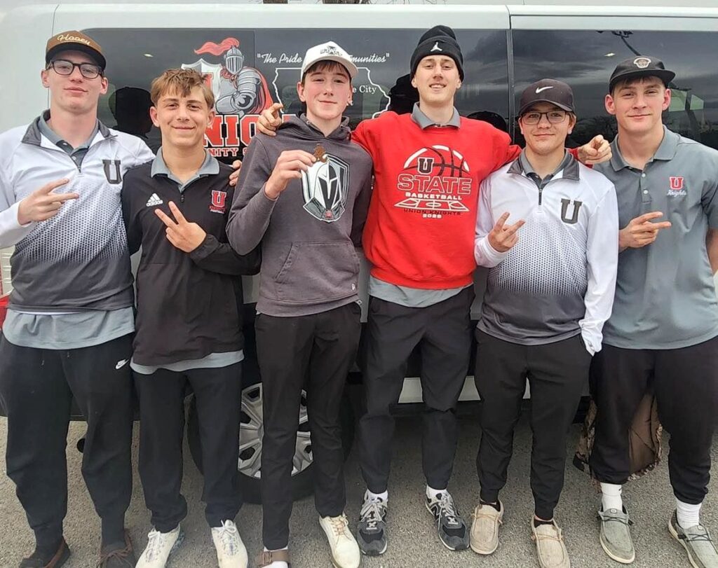 - The Union boys golf team pictured Wednesday, April 8, in Anamosa after placing second in the Wapsi Creek Invitational. Nash Schmitz, third from left, finished third overall for the Knights with 77. PHOTO COURTESY RYAN SLATER