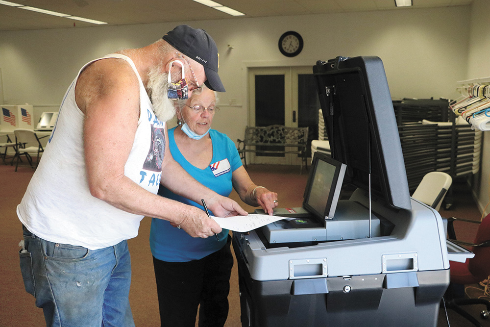 Bill Bonewitz inserts his ballot into the machine with some help from Karlene Cochran at the North Tama Activities Center in Traer.